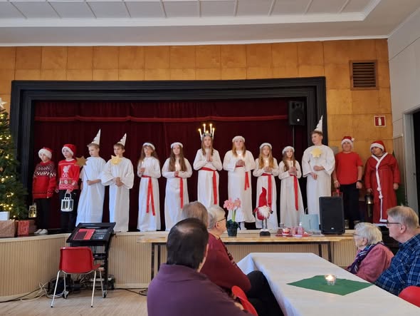 Sista caféträff för i år blev stämningsfull med besök av både luciatåg från Västra Närpes Skola och Närpes lucia med tärnor.
