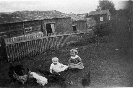 Ämnesord: bondgårdar, höns, ladugårdar, barn i småbarnsåldern |