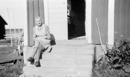 Cecilia Lund f. Vesterlund, eller Celi allmänt kallad, på stugtrappan. Hon var gift med August Lund (1874-1945).