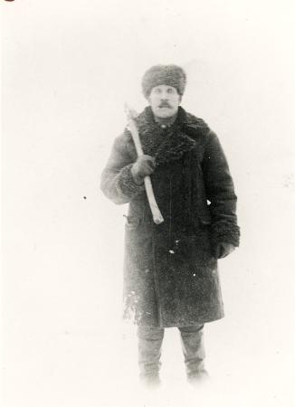 Ämnesord: män, arbetskläder, stövlar, yxor, vinter, vinterkläder, köld |