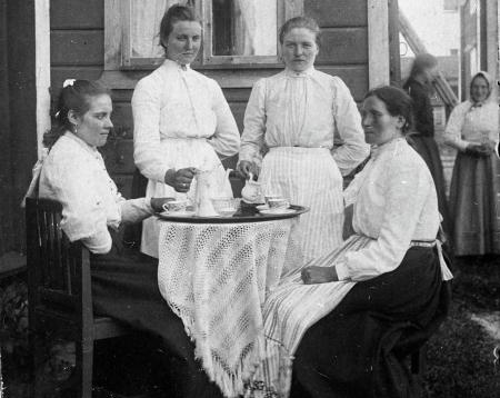 Ämnesord: kvinnor, kaffekoppar, sommar, förkläden, bjudningar |