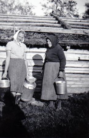 Elvina Snickars (1880-1950) från ”Bernhaddas” och okänd kvinna är på väg att påbörja mjölkningen i gårdens ”skärinöts” vid skäristugan vid Fårskatvik, Börskär.