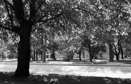 Ämnesord: kyrkobyggnader, träd, parker, tegelbyggnader |
