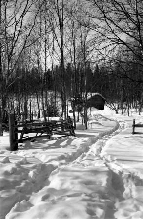 Ämnesord: inhägnader, träd, snö, vinter, lador |