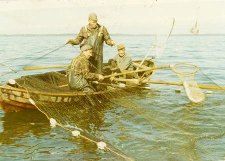 Ämnesord: fiskare, hav, lax, åror, fisknät, roddbåtar, regnkläder |