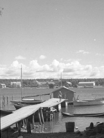 Ämnesord: skolbyggnader, båtar, järnvägsstationer, bryggor |